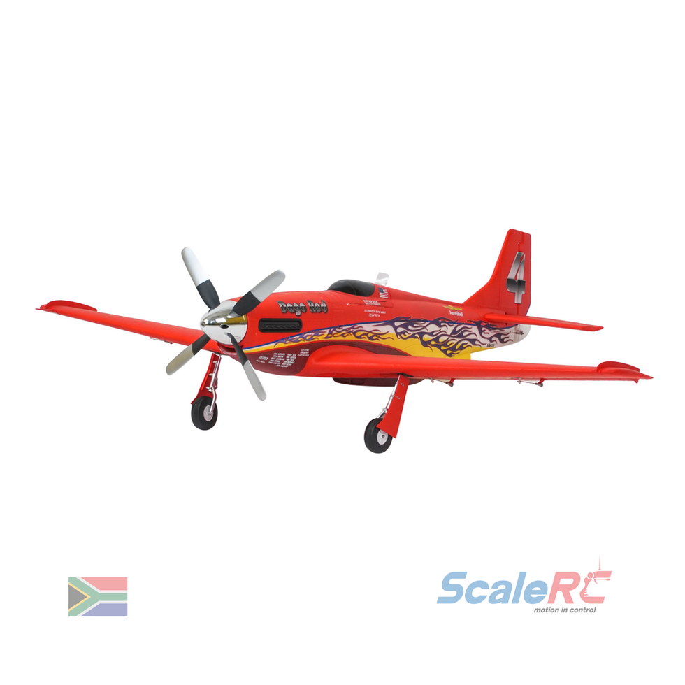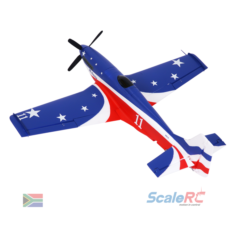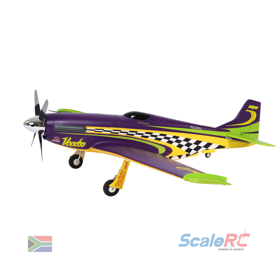 Built with robust EPO material and painted with environmentally friendly water-based paint, the P-51 racer looks gorgeous at any speed and altitude. Reach speeds in excess of 90 mph thanks to the highly efficient four-bladed prop, 900kV motor, 80A ESC and 14.8V 2,600 mAh battery.