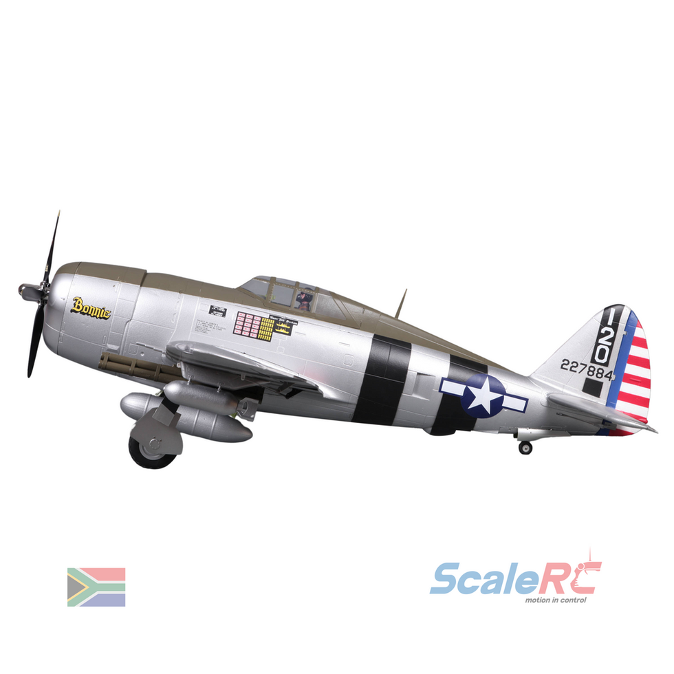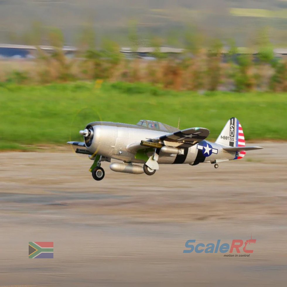The new P-47 shows great detail by including 99% scaled control surface, landing gear cover, cockpit interiors, plastic cowling, gun turrets, retracted landing gear, and panel lines.
