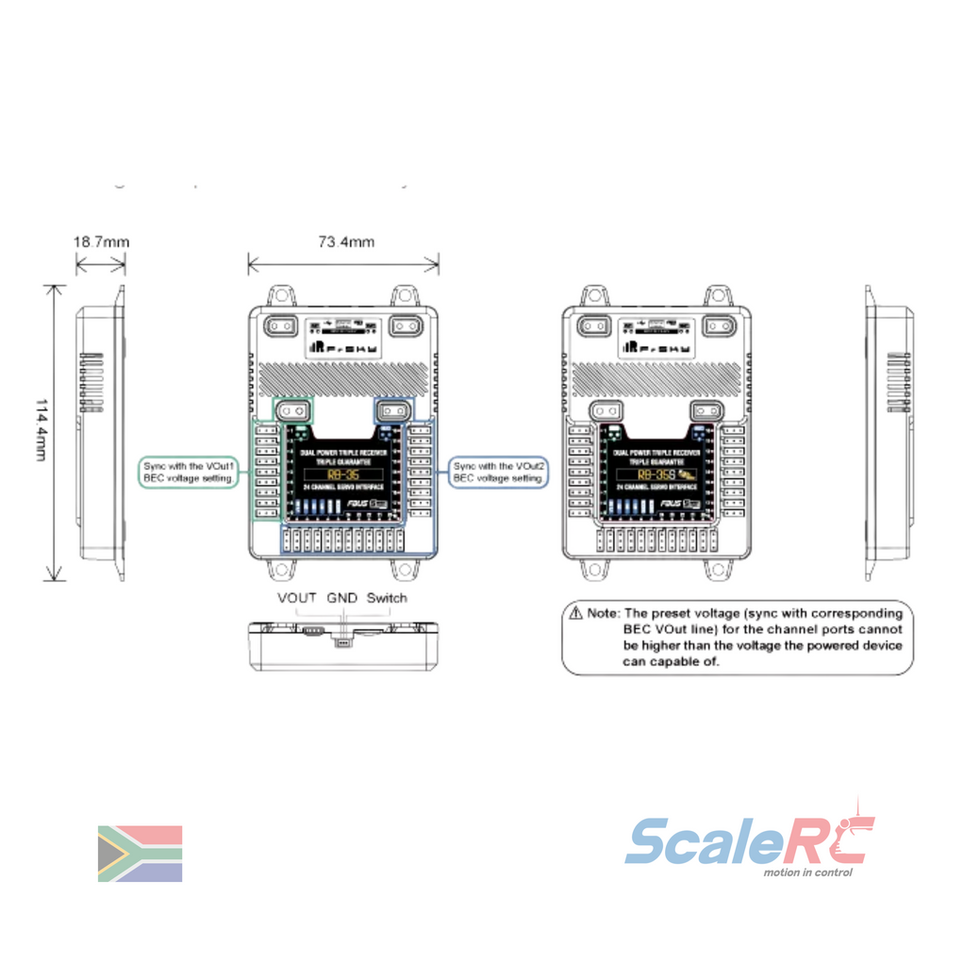RB-35/RB-35S has been designed to offer both dual-power and triple-receiver redundancy. This provides the user triple receiver signal and telemetry redundancy by adding multiplex ports (RX1-3 IN / S.Port). Dual-power provides a safe and efficient way to power the system with your power sources connected via a pair of standard XT30 connections.