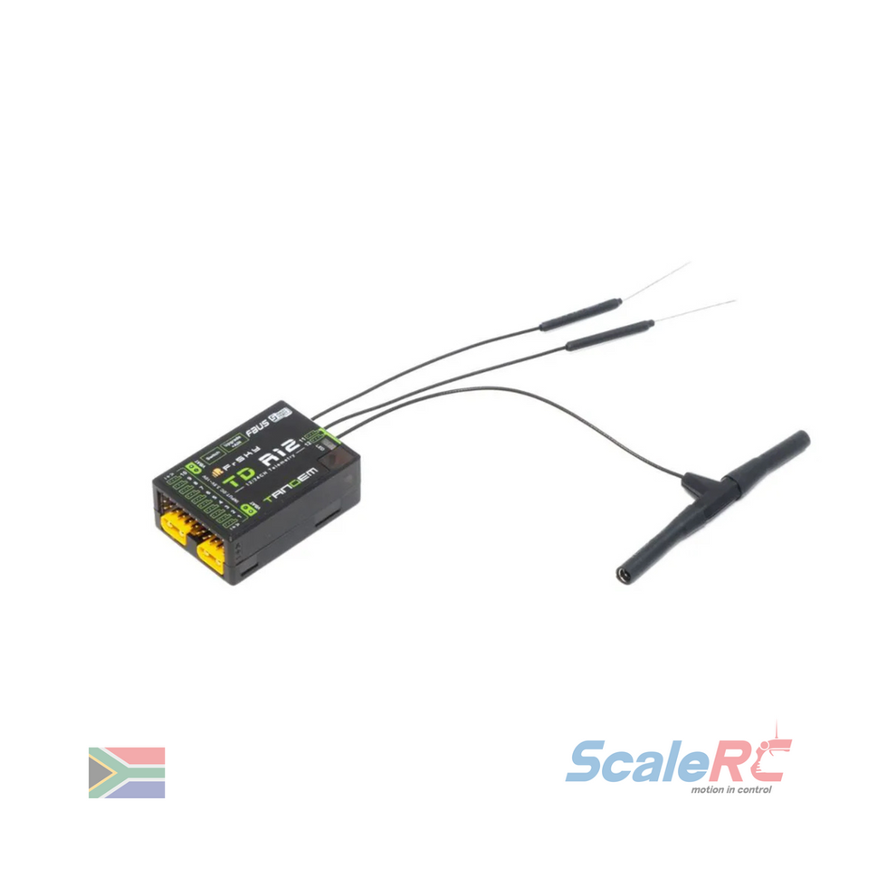 The TD R12 receiver is equipped with a triple antenna (2×2.4G & 1×900M) design that provides multi-directional wide coverage for the remote signal and is designed for RC users who want to benefit from resilience and long-range in their radio communications.