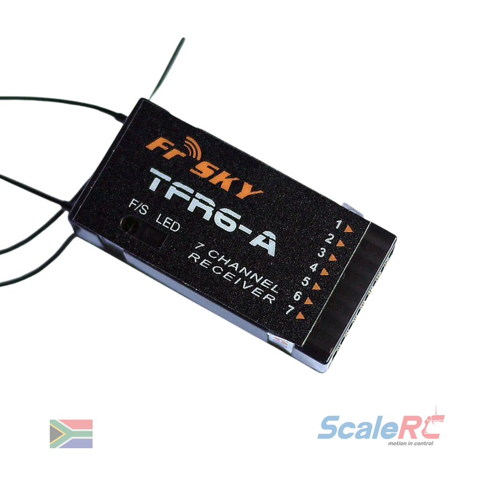 The TFR6-A is a high quality 7 channel receiver from FrSky that is compatible with all Futaba FASST series radios. The TFR6-A features end pins to enable even more compact installation.The TFR6-A supports two selectable failsafe setting options, either set failsafe positions for each channel on your transmitter, or set the failsafe on the TFR6-A.The failsafe function is supported for all channels.