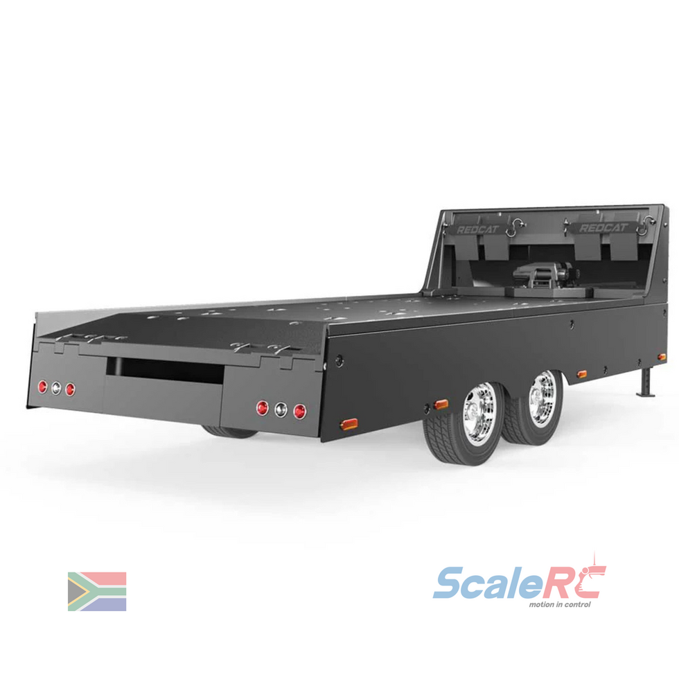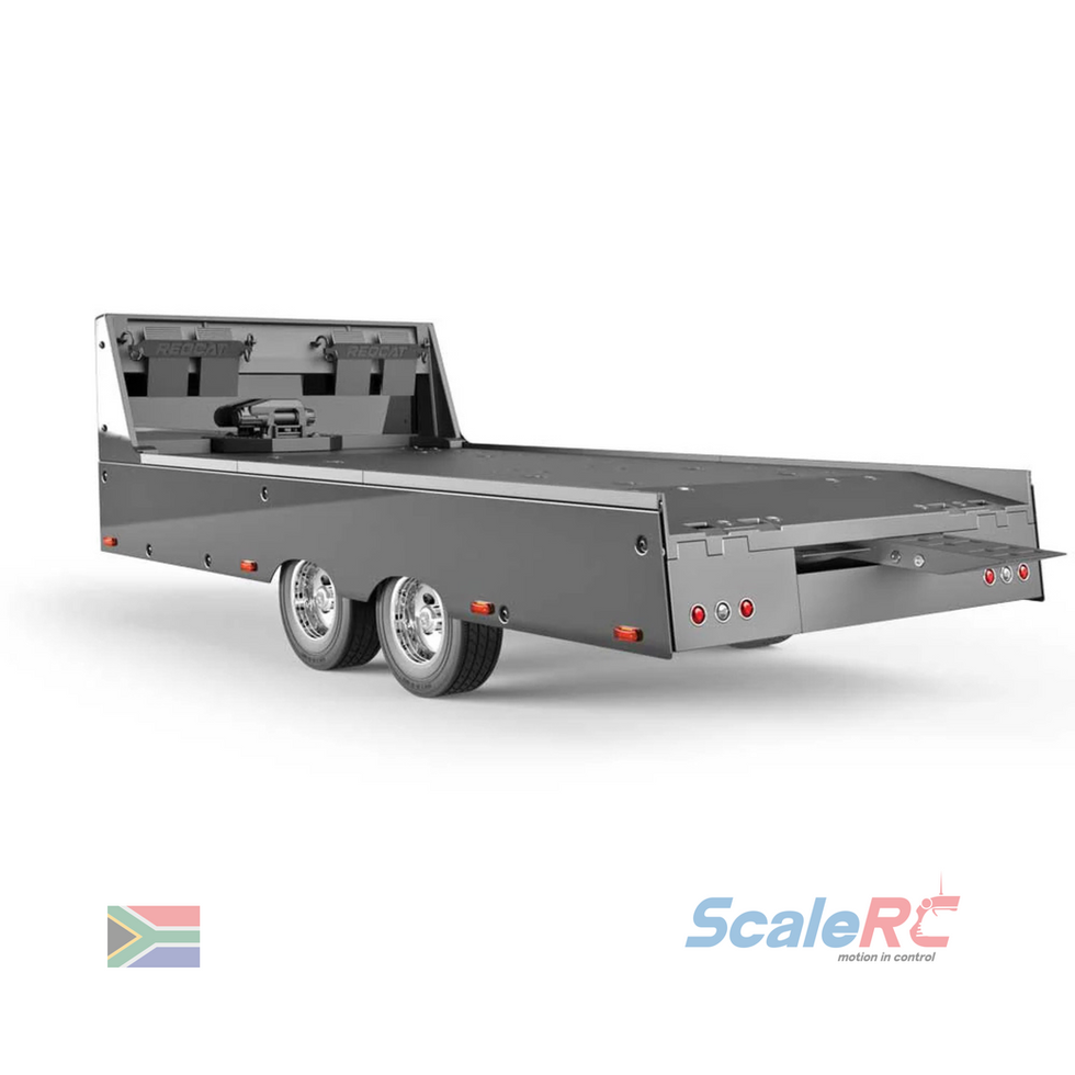 The Custom Trailer is an extremely detailed 1/10 scale car hauler trailer. This true-to-scale vehicle transport trailer is large enough to carry 1/10 scale vehicles and can be towed by most popular 1/10 scale RC vehicles. Included are a universal tow hitch, as well as a secondary hitch to be used with the Redcat Custom Hauler.